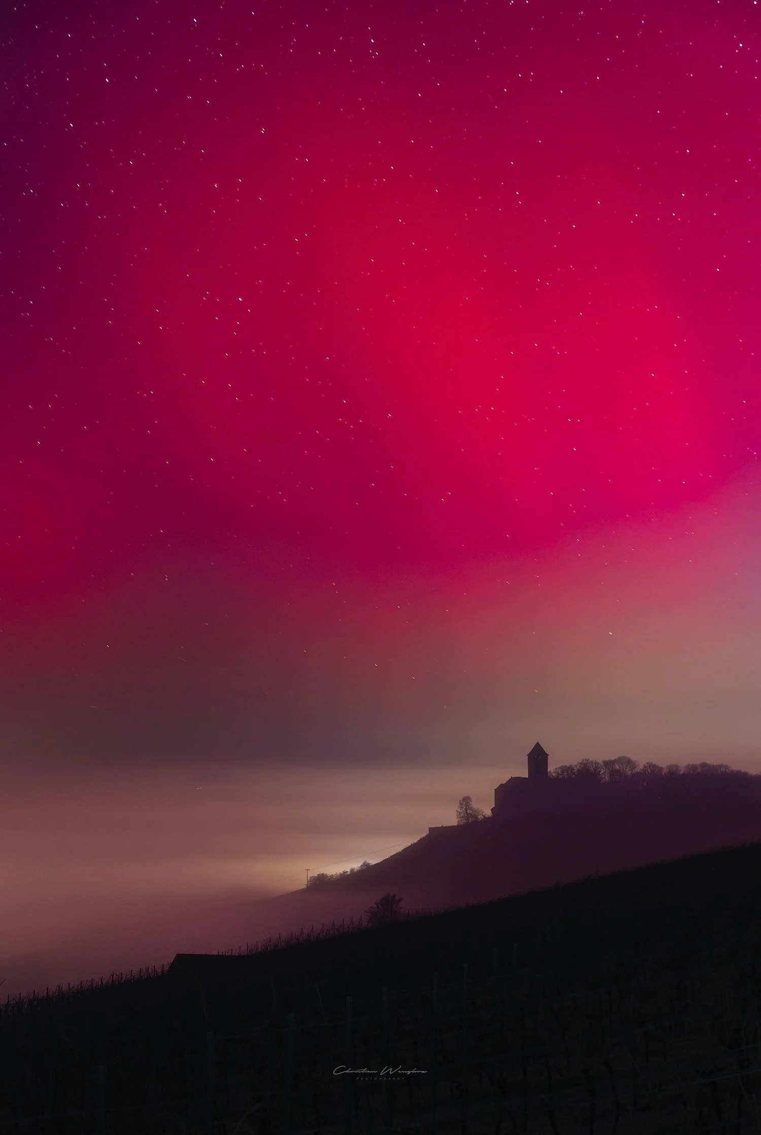 What an incredible moment! After moving to Baden-Württemberg, I never would have imagined I'd ever see the Northern Lights so far south. But after a powerful solar flare, I was proven wrong. Nestled among vineyards, Lichtenberg Castle lies beneath a magnificent blanket of aurora borealis. For me, it was an absolutely breathtaking spectacle.